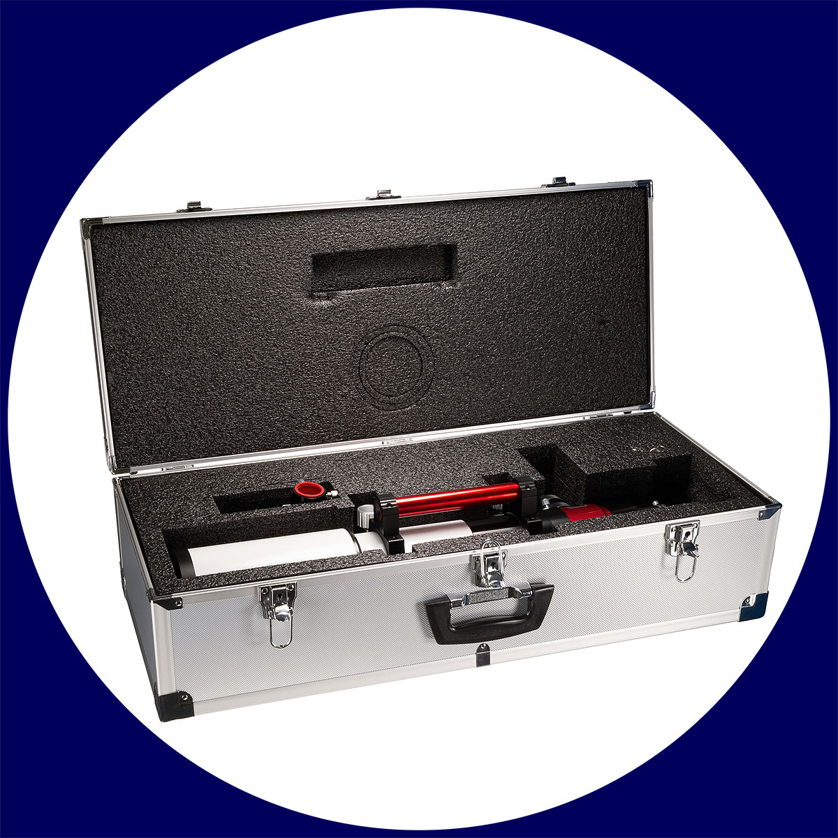 Modular aufgebautes Allzweck-Teleskop, sowohl für die Sonnen-Beobachtung in der H-Alpha-Wellenlänge als auch für nächtliche Himmelsbeobachtungen. Einfacher Umbau zwischen den verschiedenen Anwendungen mit wenigen Handgriffen. 3-linsiges apochromatisches Teleskop mit FPL-53 Glas, 100mm Öffnung und 714mm Brennweite - hervorragende Bildqualität bei der H-Alpha-Sonnenbeobachtung und am nächtlichen Sternenhimmel.