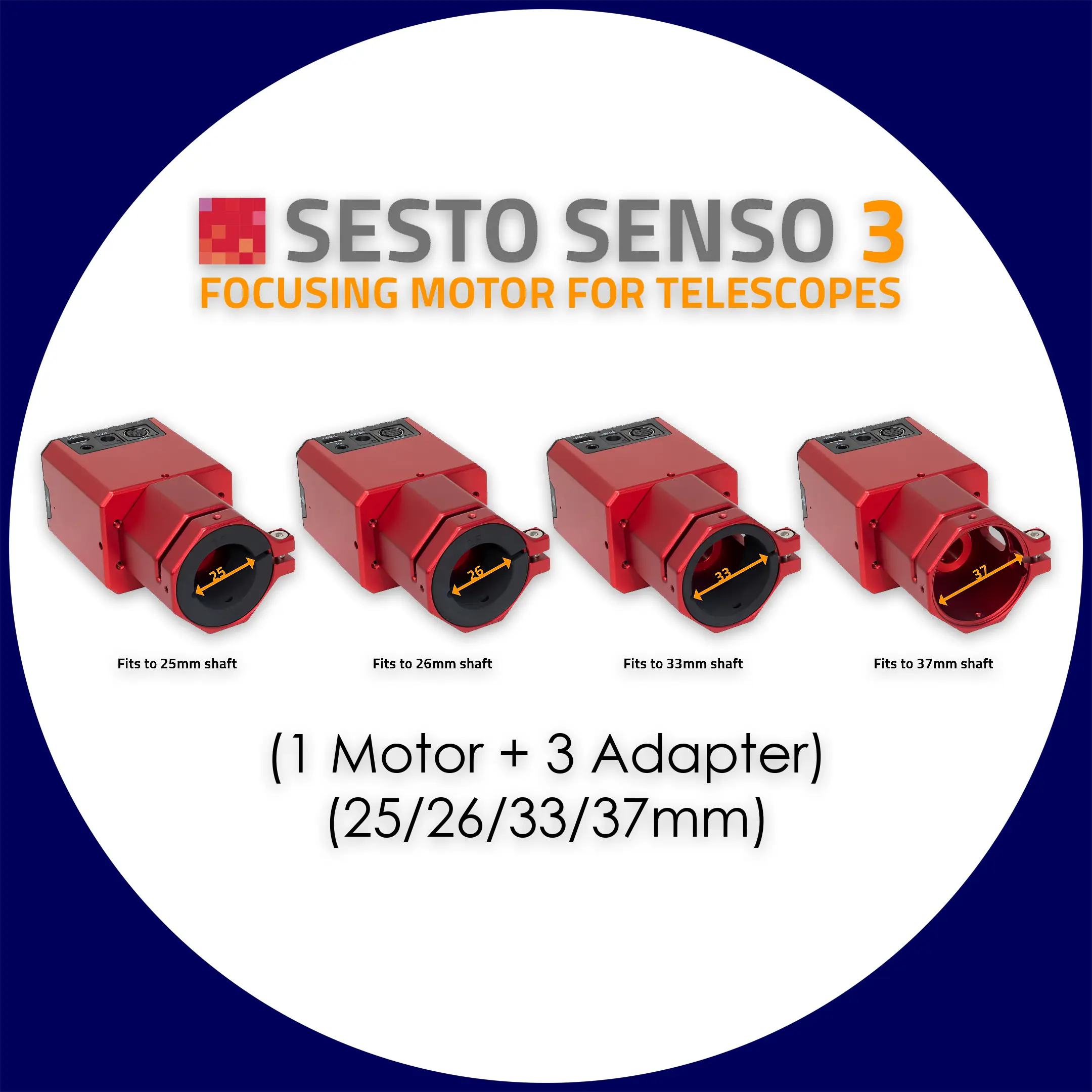Der SESTO SENSO 3 ist mit vielen Teleskopen kompatibel (im Lieferumfang enthaltene Buchsen: rot für 2,5mm Durchmesser, schwarz für 2,8mm Durchmesser, blau für 2,4mm Durchmesser, grün für 3,5mm Durchmesser, silber für 3,1mm Durchmesser, gold für 4mm Durchmesser), darunter (aber nicht beschränkt auf):