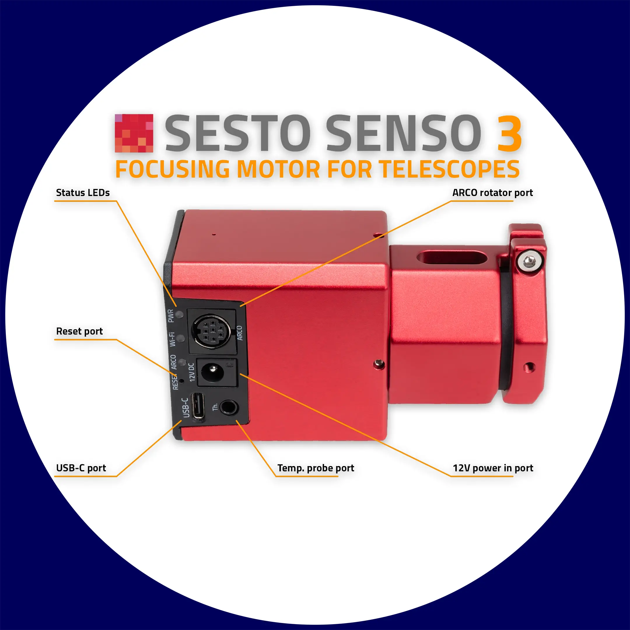 Der SESTO SENSO 3 verfügt über ein kompaktes und leichtes Gehäuse, in dem die gesamte Steuerelektronik untergebracht ist, mit praktischen Anschlüssen an der Seite. Der Motor verfügt über dimmbare Status-LEDs, die vollständig ausgeschaltet werden können, um Blend-/Streulicht bei nächtlichen Beobachtungen oder Aufnahmen zu minimieren. Die Konnektivität ist optimiert und effizient: Ein USB-C-Anschluss ermöglicht den Anschluss an einen EAGLE- oder beliebigen Windows®-Computer über das mitgelieferte USB-Kabel; der dedizierte ARCO-Anschluss ermöglicht sowohl die Stromversorgung als auch die Steuerung eines optionalen ARCO-Kamerarotators über ein einziges Kabel; Der 12-V-Stromanschluss (5,5/2,5 mm, mittig positiv) versorgt sowohl den Motor als auch die interne Elektronik über das mitgelieferte Kabel im Zigarettenanzünder-Stil (oder über ein optionales Kabel für den direkten Anschluss an den EAGLE) mit Strom. Über einen Temperatursensoranschluss können Sie die optionale Sonde anschließen, um sie mit Software von Drittanbietern zu verwenden, die eine automatische Fokuskorrektur basierend auf Änderungen der Umgebungstemperatur unterstützt.