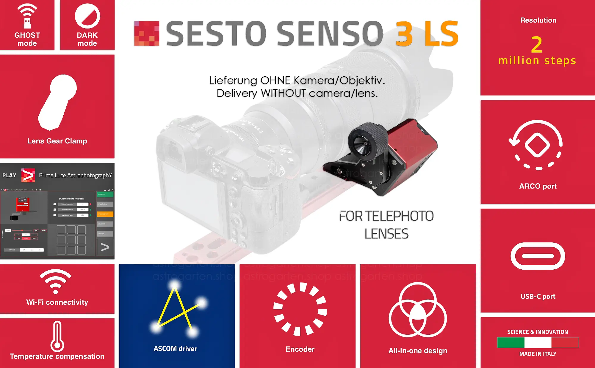 SESTO SENSO 3 LS ist ein Roboter-Fokussiermotor, der speziell für die präzise motorisierte Fokussierung von Teleobjektiven (Canon, Nikon und andere) entwickelt wurde. SESTO SENSO 3 LS wurde in Italien von PrimaLuceLab entwickelt und hergestellt und baut auf der Technologie von SESTO SENSO 3 auf. Er verfügt über die neue Lens Gear Clamp (LGC), eine maßgeschneiderte mechanische Schnittstelle, die den Motor direkt mit Fotoobjektiven verbindet, um den Fokusring kompatibler Fotoobjektive mit äußerster Präzision und ohne Spiel zu drehen, wodurch externe Riemen überflüssig werden (obwohl für Objektive mit sehr steifen Fokussiermechanismen optional ein Riemen erhältlich ist) und einen integrierten Positionsgeber bietet, der die Motorposition auch bei manuellen Einstellungen mit der Option „Automatic Position Recovery” (automatische Positionswiederherstellung) verfolgt. Die LGC verfügt außerdem über eine Arca-Swiss-Halterung, mit der SESTO SENSO 3 LS einfach an einer neuen "PLUS"-Vixen-Schwalbenschwanzschiene befestigt und auf jeder Teleskopmontierung mit einer Standard-Vixen-Klemme montiert werden kann.