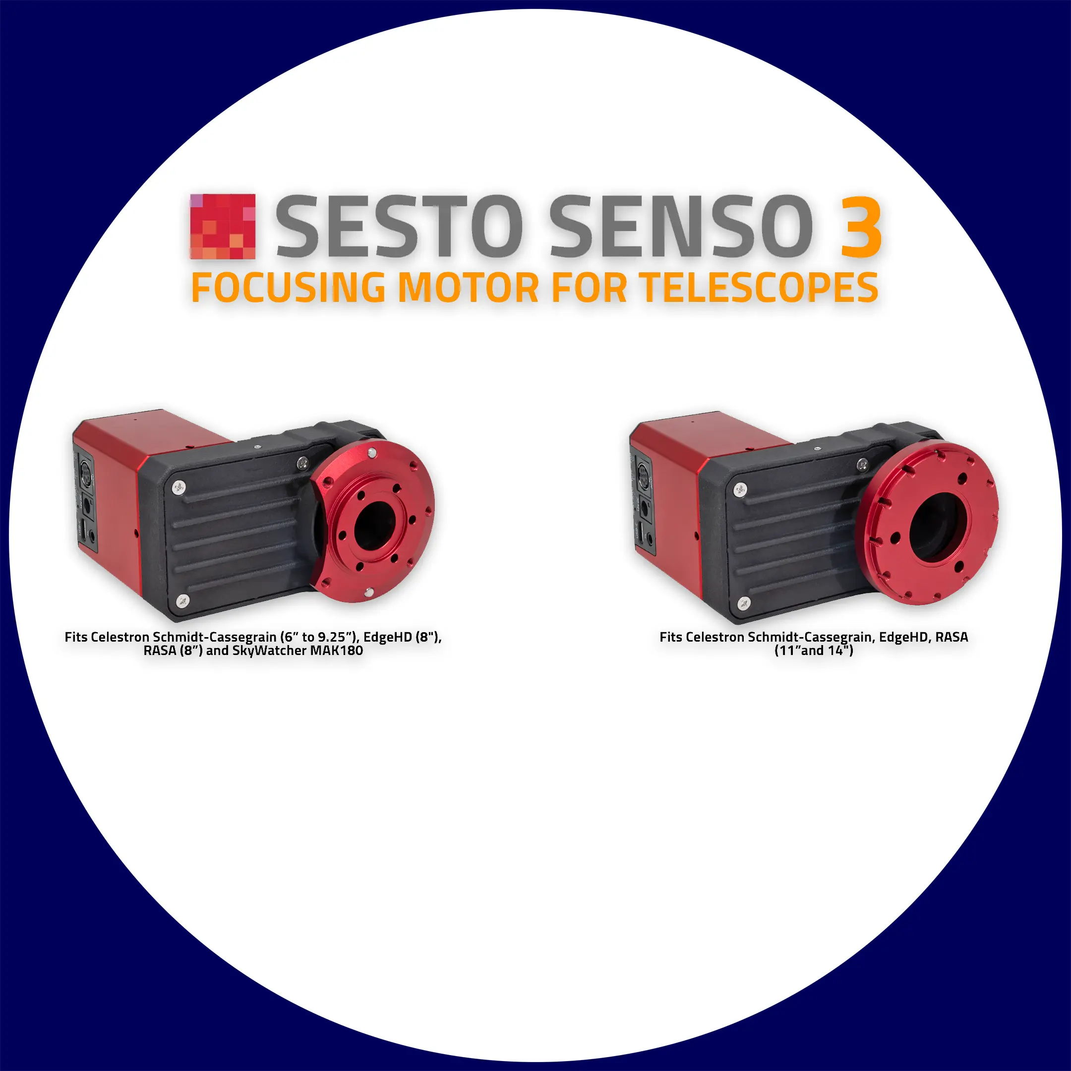 SESTO SENSO 3 SC ist ein fortschrittlicher Roboter-Fokussiermotor, der speziell für Schmidt-Cassegrain-, EdgeHD-, RASA- und andere Teleskope mit internem Spiegel-Fokussiersystem entwickelt wurde. Er wurde in Italien von PrimaLuceLab entwickelt und hergestellt verfügt er über wichtige Innovationen wie die Direct Pulley Clamp (DPC) – eine spielfreie, riemengetriebene Kupplung, die jederzeit eine präzise motorisierte Fokussierung und manuelle Einstellung ermöglicht – mit integriertem Positionsgeber, der auch bei manuellen Einstellungen die Motorposition verfolgt (auch mit Option zur automatischen Positionswiederherstellung), und einem hochauflösenden Motor mit bis zu 2 Millionen Schritten, der unabhängig von der mechanischen Untersetzung des Teleskops eine optimale Steuerung gewährleistet.