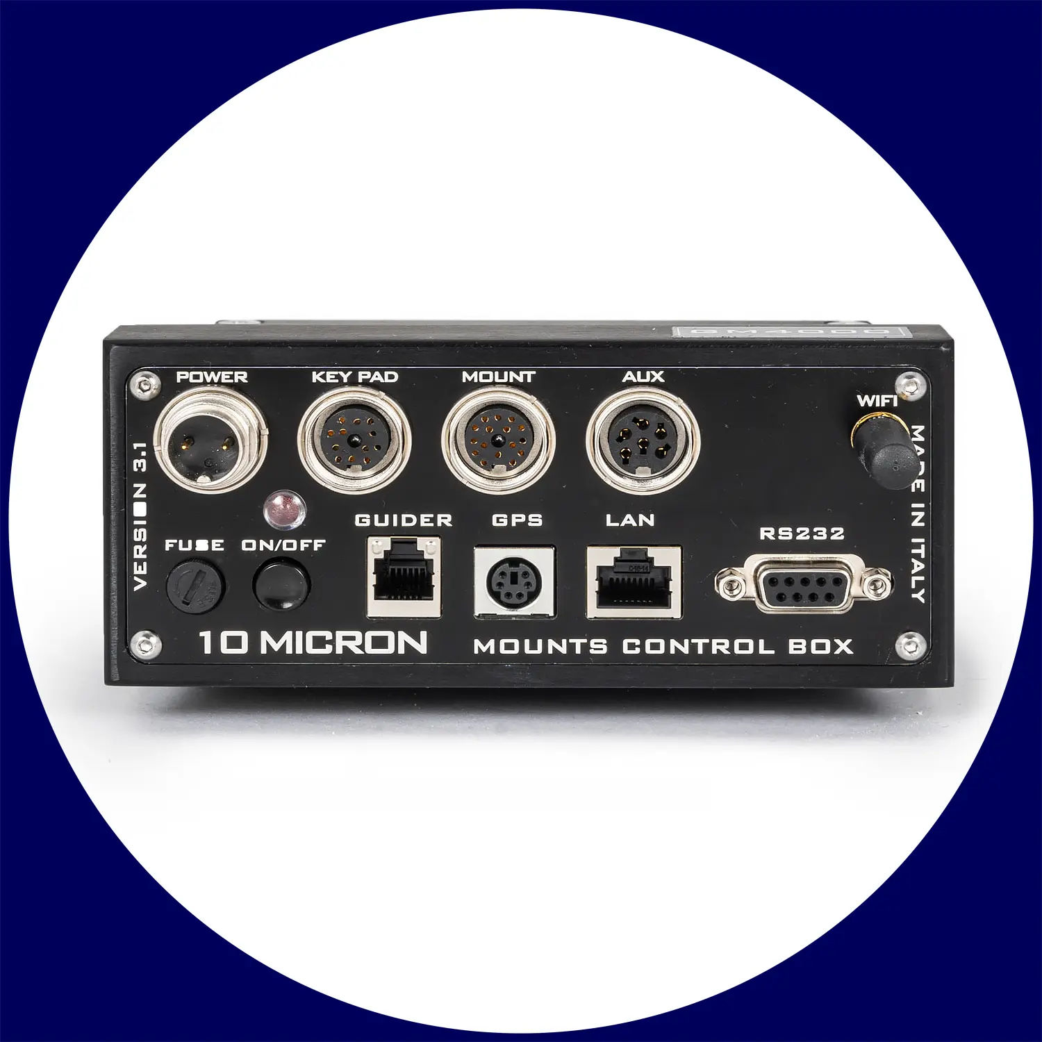 | PC Steuerung | Remote control über RS-232, Ethernet; eigener 10Micron ASCOM Treiber, LX200 kompatibles Protokoll; Update der Firmware und Bahnelementen von Kometen, Asteroiden und künstl. Satelliten über RS-232 oder Ethernet; PC Steuerung über Virtual KeyPad via RS-232 oder Ethernet. Integriertes Wi-Fi Modul für Steuerung über SmartPhones, I-pads und Tablets. |
