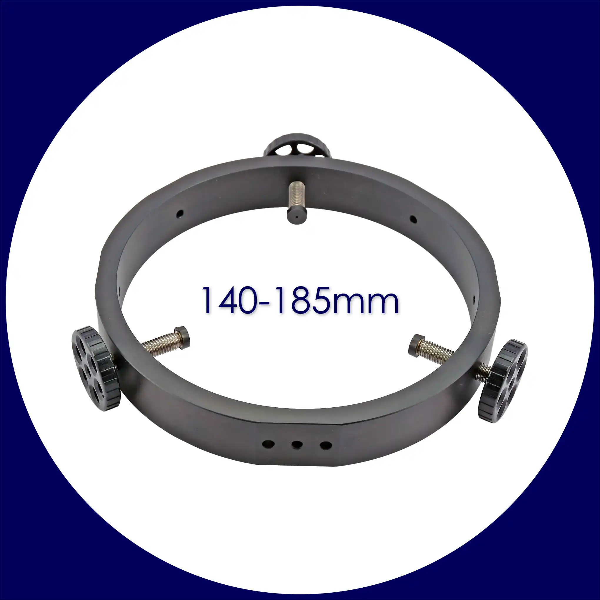 Drei Justierschrauben (M10) mit einem Durchmesser von 10mm und kugelgelagerter Auflagefläche aus V2A-Stahl, überzogen mit einer Hartgummikappe, sorgen dafür, dass sich die Schraubenandruckfläche beim Justieren des Fernrohrs nicht mitdreht. Das Leitfernrohr sitzt fest, rutschsicher und wird nicht verkratzt. Am Außendurchmesser befinden sich vier weitere gefräste Planflächen mit Fotogewindebohrungen, um weiteres Zubehör an den Ringen zu befestigen oder mehrere Ringe miteinander zu verbinden.