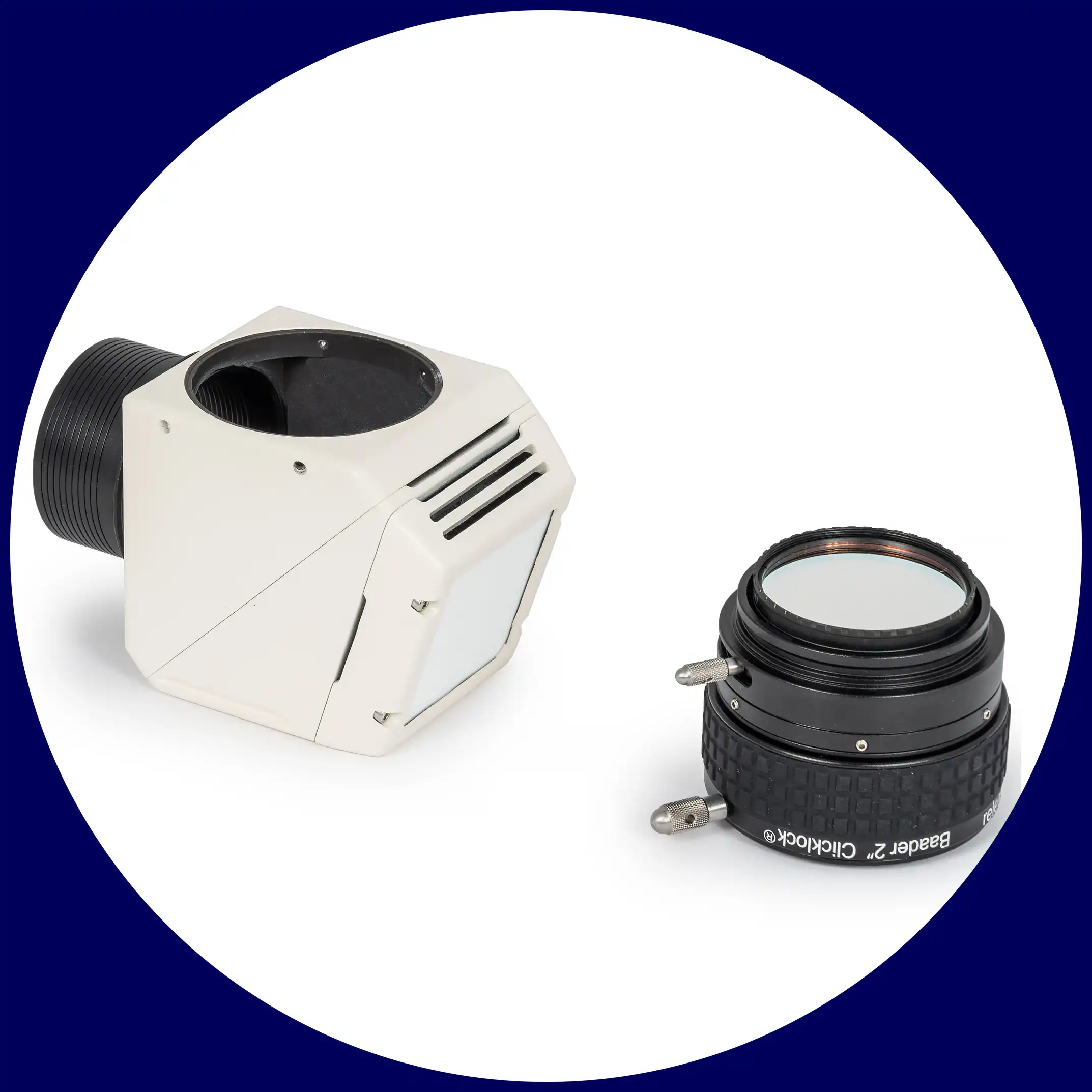 - Integrierte Rotationsvorrichtung für optionale Polarisationsfilter – die beste Methode für die Helligkeitseinstellung bei der visuellen Sonnenbeobachtung und Sonnenfotografie im Weißlicht.
