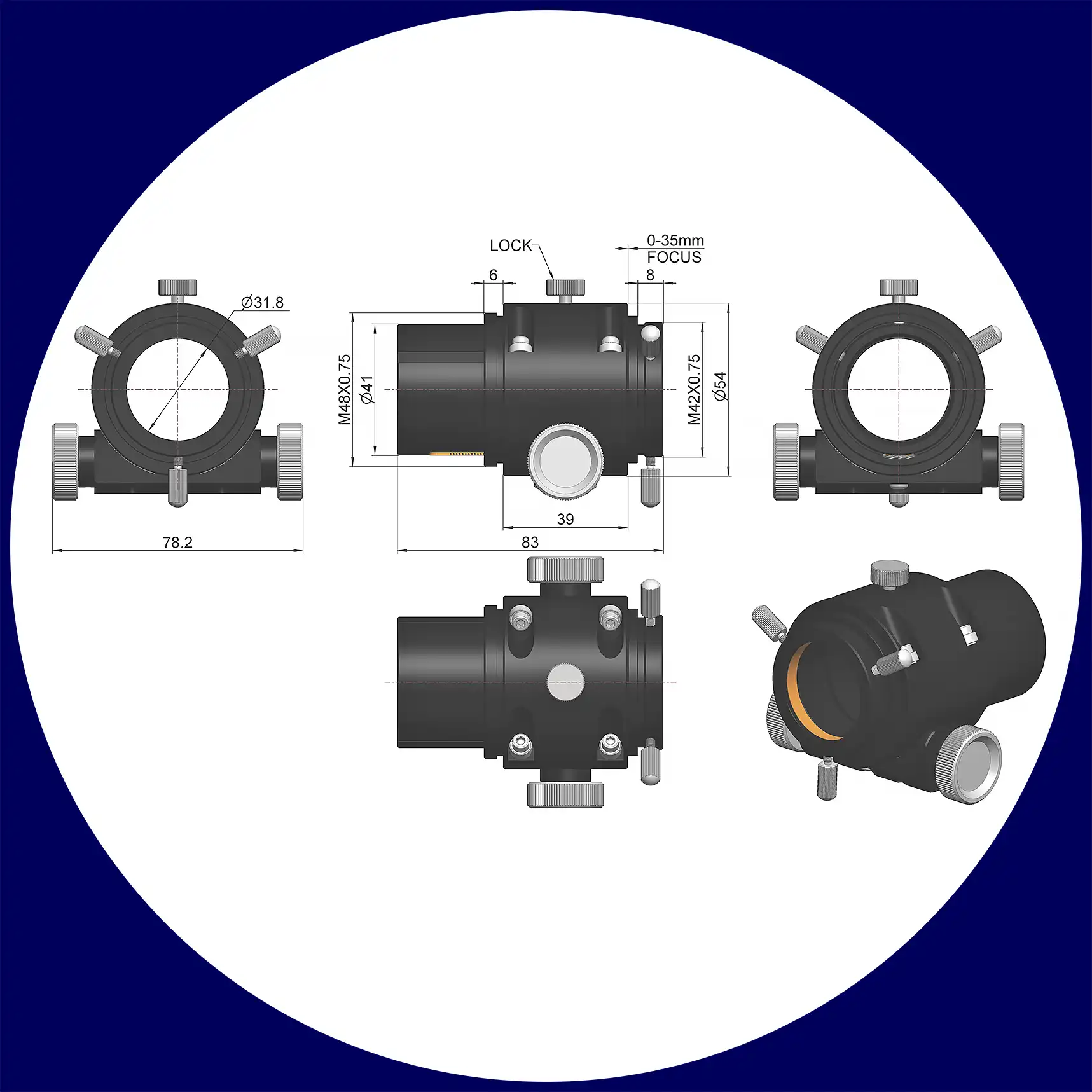 Tip(p): Es lässt sich z. B. auch eine optionale Nachführkamera mit M42x0,75 Innengewinde fest adaptieren – drehbar ist die Einheit dann über die Rohrschellen. So erhalten Sie ein absolut verkippungsfreies System.